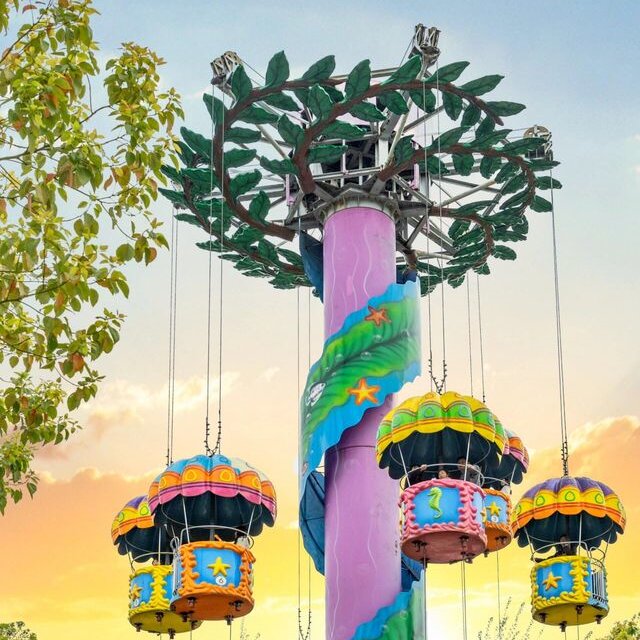 السلامة أمر بالغ الأهمية, with secure cage-like seating and advanced braking technology ensuring a safe and comfortable ride every time. The tower’s playful colors and whimsical details—such as swirling ocean waves and starfish motifs—make it not just a thrilling ride, but also a striking visual landmark that attracts visitors from afar.