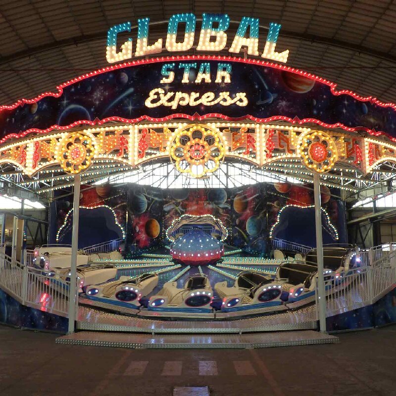 This model offers an excellent balance of capacity and footprint. It features 18 cabins with a total capacity of 36 Passagiere, making it ideal for efficient operation and steady guest flow. With an area size of 14 M und a 12 m rotating diameter, it delivers a wide, sweeping spin experience while remaining compact enough for many outdoor park layouts. Die Fahrt ist 3 m height makes it approachable and family-friendly, while still providing strong visual presence through its lighting and themed panels.