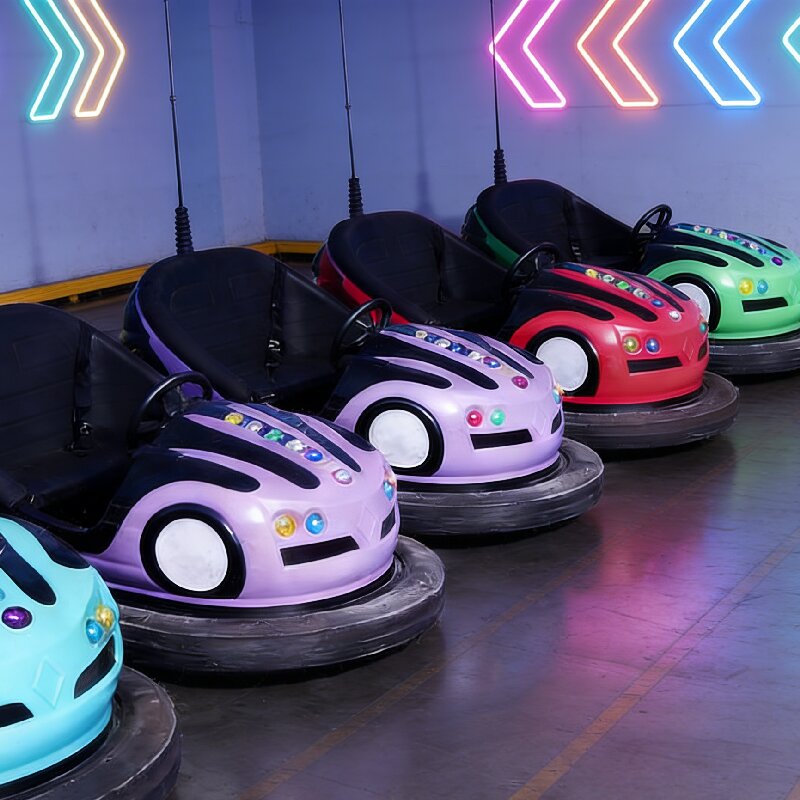 Immersive Experience and Performance Equipped with a vertical power pole (the “trolley pole”) and high-performance motors, our ceiling bumper cars deliver instant torque and smooth acceleration. The vibrant, automotive-grade paint schemes are complemented by integrated LED accent lighting, creating a high-energy atmosphere as sparks dance along the ceiling grid.