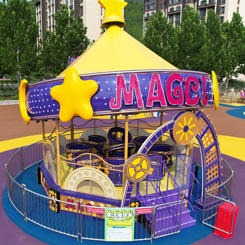 The design incorporates a rotating platform surrounded by magical decorations such as glowing stars, crescent moons, and playful gears. The carriages are shaped like charming magic balls, and each is equipped with a gentle water spray system that adds an extra layer of fun—perfect for warm days or indoor mist effects. With soft music and dynamic lighting, kids are fully immersed in a dreamlike ride experience.